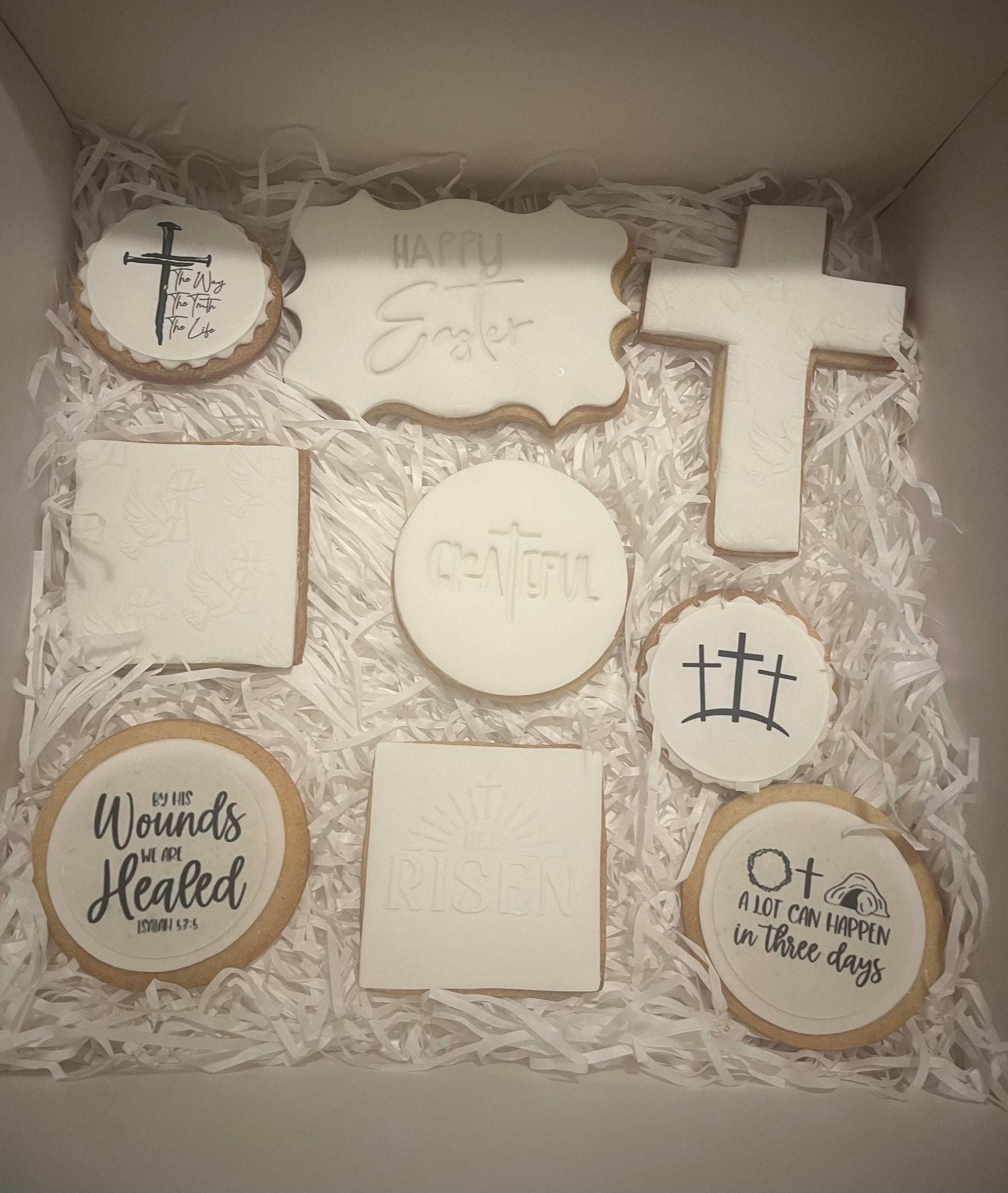 9 Christian themed “the Real Meaning of Easter” sugar cookies. Available is Vanilla, Lemon or chocolate flavour. These sugar biscuits are very similar to shortbread. Please select flavour.